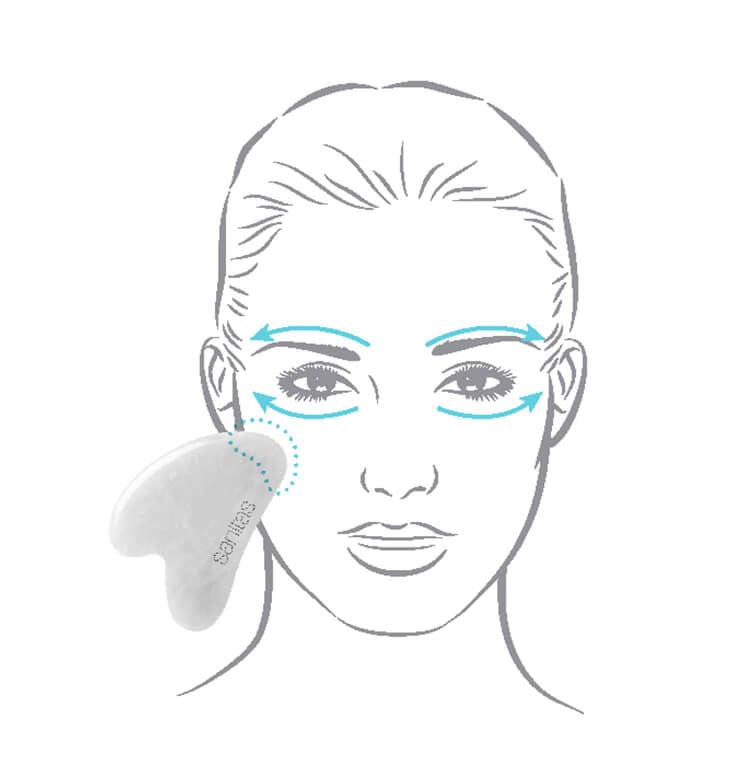 For the lower eyes, use the rounded side of the tool and gently glide along the orbital bone out to the temple. For the upper eyes, start at the upper corner and follow the upper orbital bone to the temple
